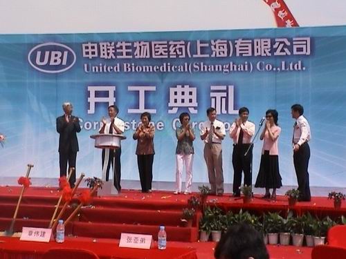 2005年6月13日上午9时30分,伴随着申联生物医药(上海)有限公司董事长、总经理胡毅安先生轻轻启动按钮,打桩机发出了隆隆的撞击声,此举宣告申联生物医药(上海)有限公司正式开工建设。上海市畜牧办赵子琴主任、胡毅安董事长、总经理、上海紫竹科学园区陈勇副总经理分别在开工仪式上致辞。