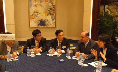 约旦皇家哈希姆王国商务部部长Maher S. Matalka与紫竹商会副会长孙法泉、上海国家动物医学研究中心总经理徐富荣等企业代表进行了面对面的亲切会谈,并就约旦的投资政策、优惠政策、项目审批程序、注意事项等方面行了交流,参与会谈的还有约旦当地生物医药企业高层,宾主双方就动物疫苗培育制作等可能开展并扩大的项目合作展开了深入的讨论。